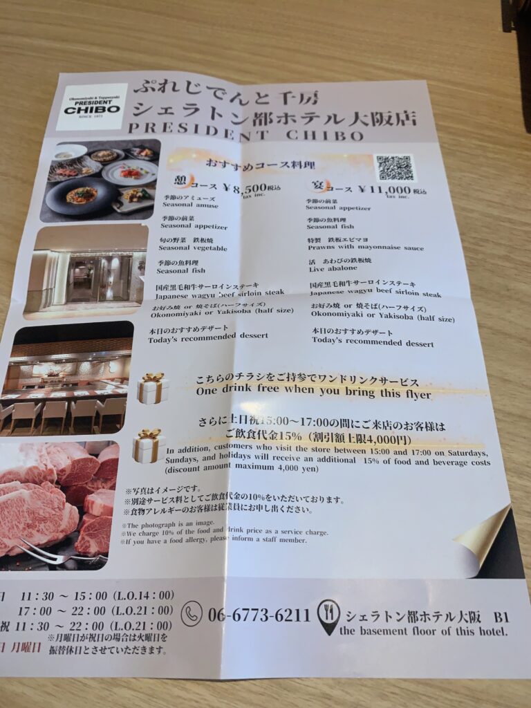 プレジデント千房でコースランチ|シェラトン都ホテル大阪でコスパ良く楽しめたよ